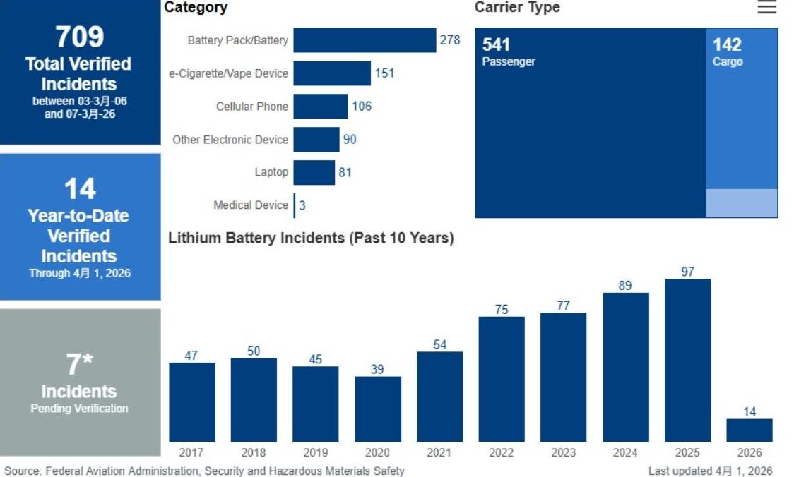 美國聯邦航空總署(FAA)網站上有專門的「Lithium Battery Air Incident」鋰電池事故統計,從2021年以來每一年飛機上的鋰電池事故都是有增無減,2023年有77起事故,2024年有89起,到了2025年則有97起,今年1月也發生了14起。