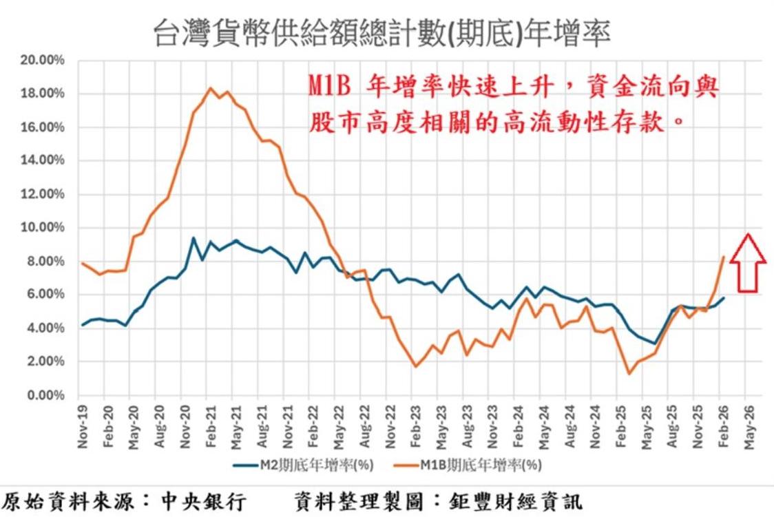 更值得關注的是結構面的變化。M1B年增率高於M2,顯示資金不僅在增加,而且正朝向「更高流動性」移動。換言之,市場上的錢不只是多,而是變得更「活」,更容易流入股市與風險性資產。