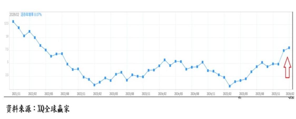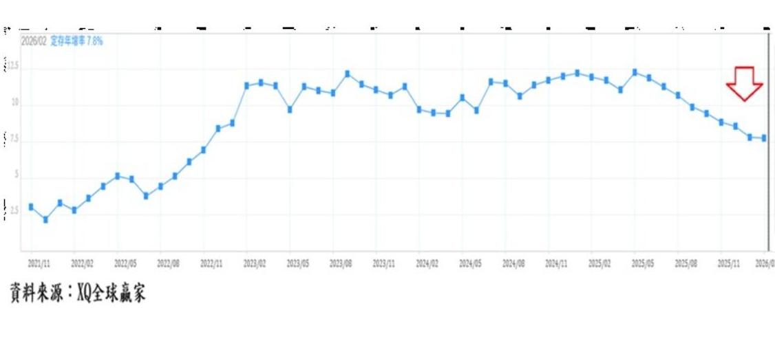 這一點,從存款結構可以得到進一步驗證。活期存款年增率自2025年3月的0.66%,大幅攀升至2026年2月的8.07%;反觀定期存款年增率,則由高峰12.32%一路滑落至7.8%。這種「由定轉活」的資金轉移,意味著投資人風險偏好正在提升,資金不再滿足於穩定利息,而是尋求更高報酬的去處。在當前環境下,最直接的去處,無疑就是股市。