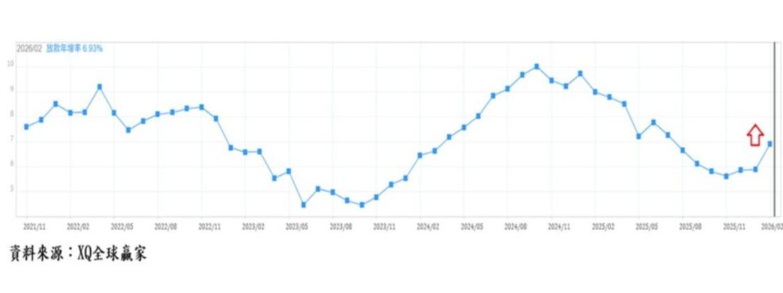 另一方面,房地產市場的變化,則進一步強化這股資金轉向的趨勢。央行先前祭出第七波選擇性信用管制,包括下修貸款成數、取消寬限期等措施,已使房市明顯降溫。儘管2月放款年增率回升至6.93%,出現觸底跡象,但整體來看,不動產市場已不再是資金最熱衷的配置方向。