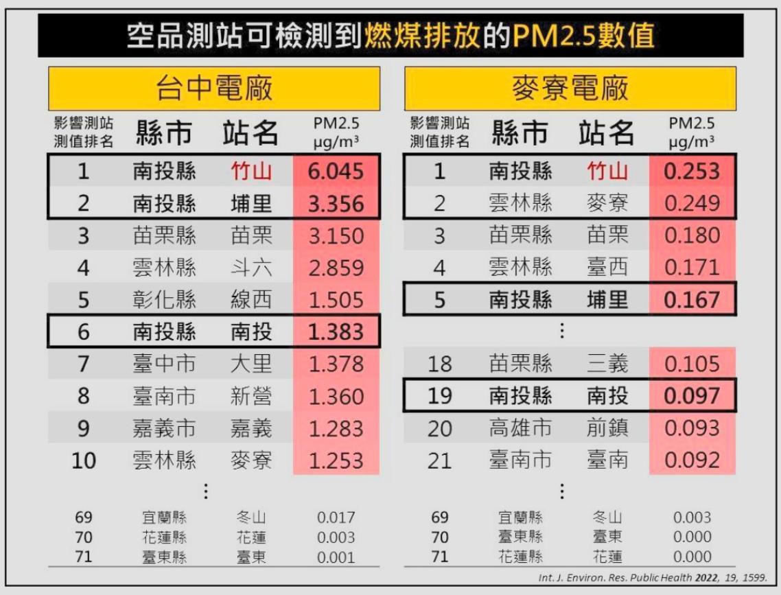 南投健康空氣行動聯盟發起人林翠蘭指出,竹山長期承受麥寮電廠與台中火力發電廠的PM2.5影響,是全台污染貢獻最高區域之一。