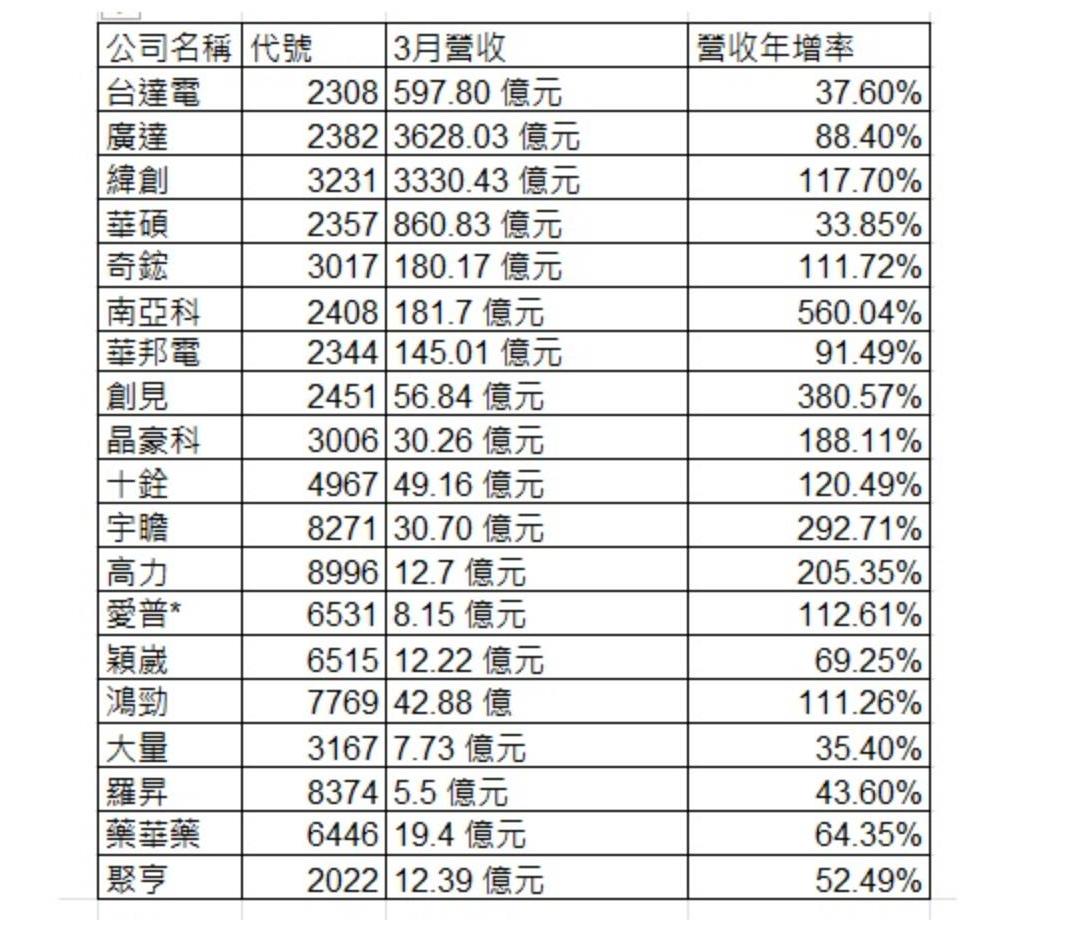 營收年增率超過30%還有廣達(2382)因受惠於輝達GB300系列AI伺服器出貨暢旺,3月營收3628.03億元,年增88.4%,創下歷史單月新高記錄。指標股緯創(3231)3月合併營收為新台幣3,330.43億元,較去年同期飆增117.7%,創下單月歷史新高。