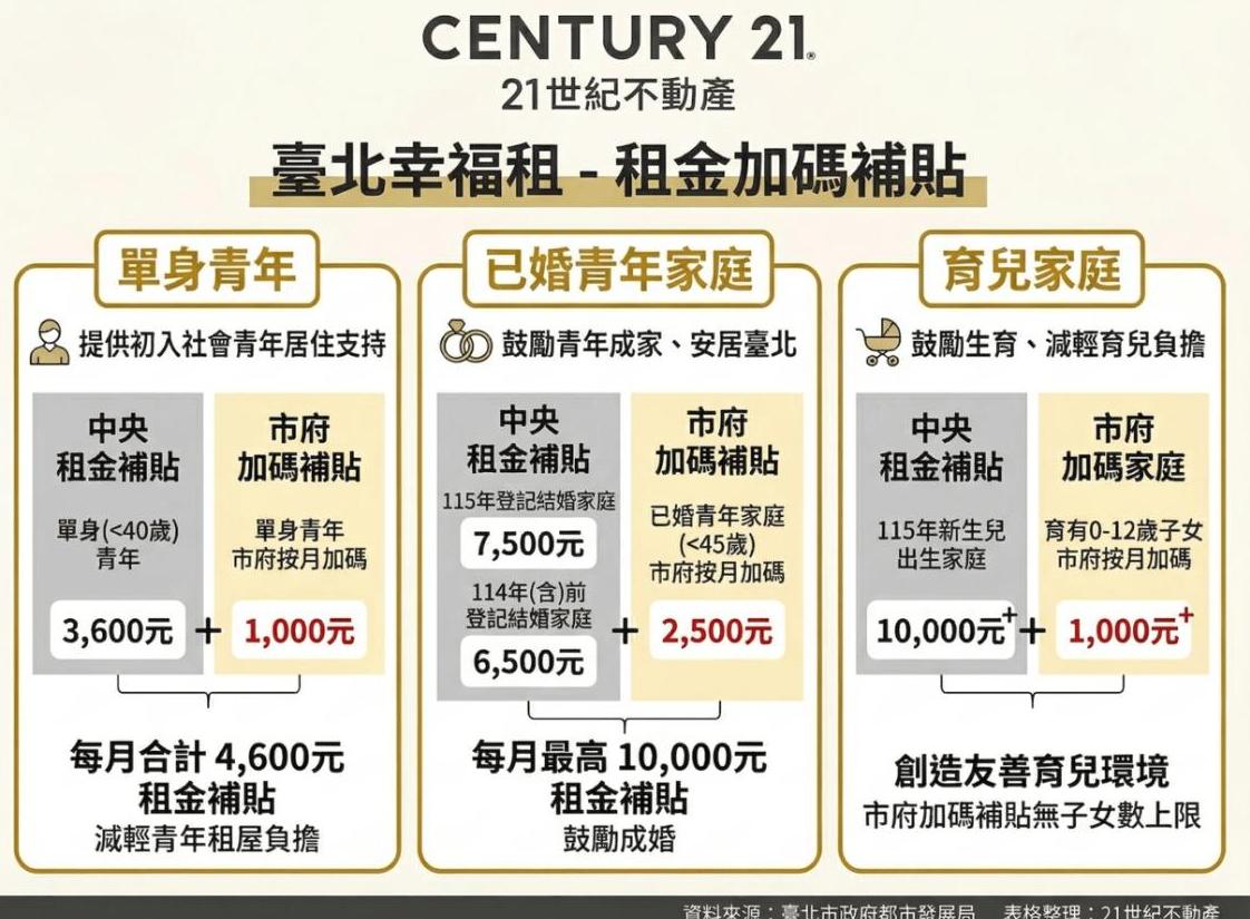 在通膨壓力未歇、居住成本持續攀升的背景下,臺北市政府推出「臺北幸福租」加碼補貼新制,為租屋市場注入新一波政策動能。隨著中央與地方資源整合,租金補貼正式進入「疊加時代」,不僅為青年與家庭帶來實質減壓,也開始改變租屋選擇與居住型態的決策邏輯。21世紀不動產指出,此次新制最大亮點在於突破過往「擇一申請」限制,透過中央與地方資源整合,提升補貼彈性與實質效益,使政策從單純補助機制進一步升級為影響市場結構的重要力量。