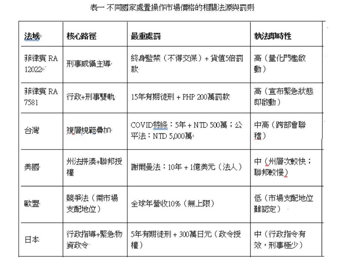 以下的表一顯示了主要民主理念相近國家對於不當囤積物資與哄抬價格的刑事責任。這些國家都還沒有明顯的灰色地帶戰爭威脅,最重處罰的某些層面就已經超越台灣,以歐盟為例,即便在沒有跟國家安全疑慮掛勾之下,濫用市場支配地位就已經可能導致全年營收10%的高額罰款,雖然有高市場佔有率的認定限制,但如果用聯合壟斷,或不正當在市場上到處收購以控制價格等角度,這類的制度設計案例,也可以某種程度適用在因應可能的經濟國安情境。