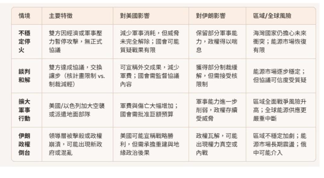 此情境被認為是短期內最可能出現的避險選項。對美國而言,停火能迅速緩和失控的能源價格與軍事預算。然而,由於伊朗的軍事結構雖受損但未被完全根除,威脅將依然存在。對於伊朗政權來說,停火提供了寶貴的喘息空間進行內部鞏固,並向國內宣示其具備干擾全球經濟的「不對稱威懾力」。