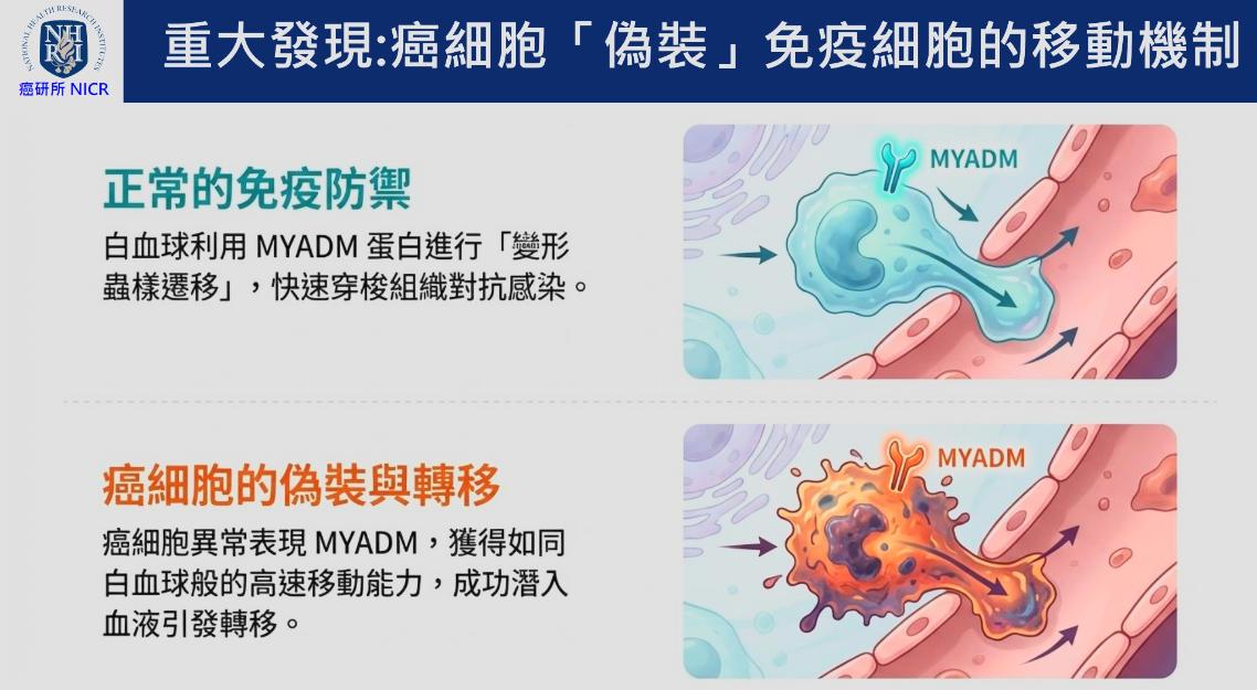國家衛生研究院(國衛院)最新研究,成功揭開癌細胞「偽裝」與轉移的重要機制,並找出關鍵標靶蛋白MYADM,不僅解釋癌細胞如何模仿免疫細胞移動,也為未來精準醫療提供全新治療方向,該成果已於2025年發表於國際權威期刊《Cancer Research》。