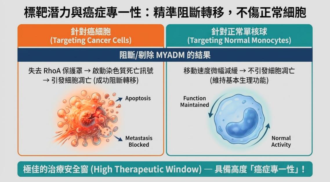 實驗顯示,抑制MYADM會誘導癌細胞凋亡,但對正常單核球細胞影響有限,顯示其安全性潛力較高。