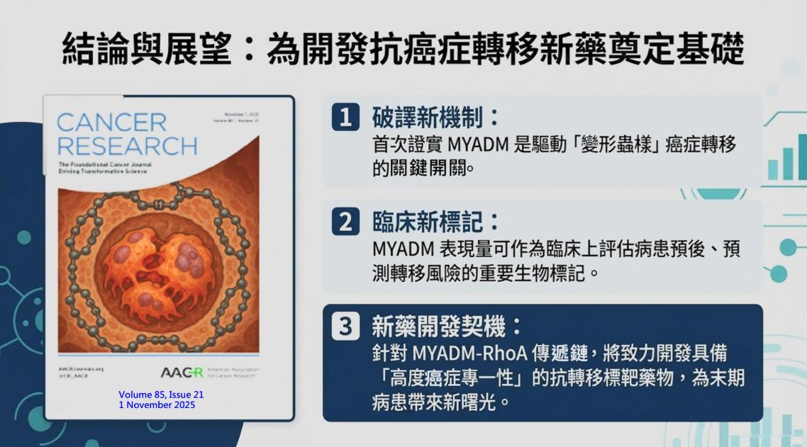 此次研究不僅揭示癌細胞如何透過「偽裝」與「模仿」提升生存與移動能力,也建立了MYADM在癌症轉移中的核心地位。