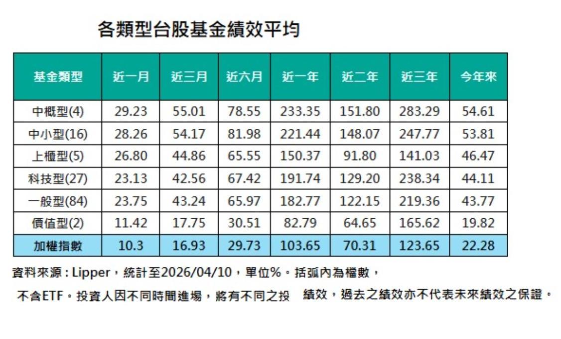 台股今年表現一飛沖天,不僅改寫歷史新天價,漲勢在全球主要股市中名列前茅,市值更是逼近全球第6大,也帶動台股基金績效表現跟著水漲船高。玉山投信指出,統計台股基金績效表現,幾乎各類型平均績效皆超越加權指數,今年來包括中概型、中小型、上櫃型、科技型等,報酬率皆超越大盤一倍起跳,甚至達逾兩倍之多,也讓台股基金投資人樂開懷。