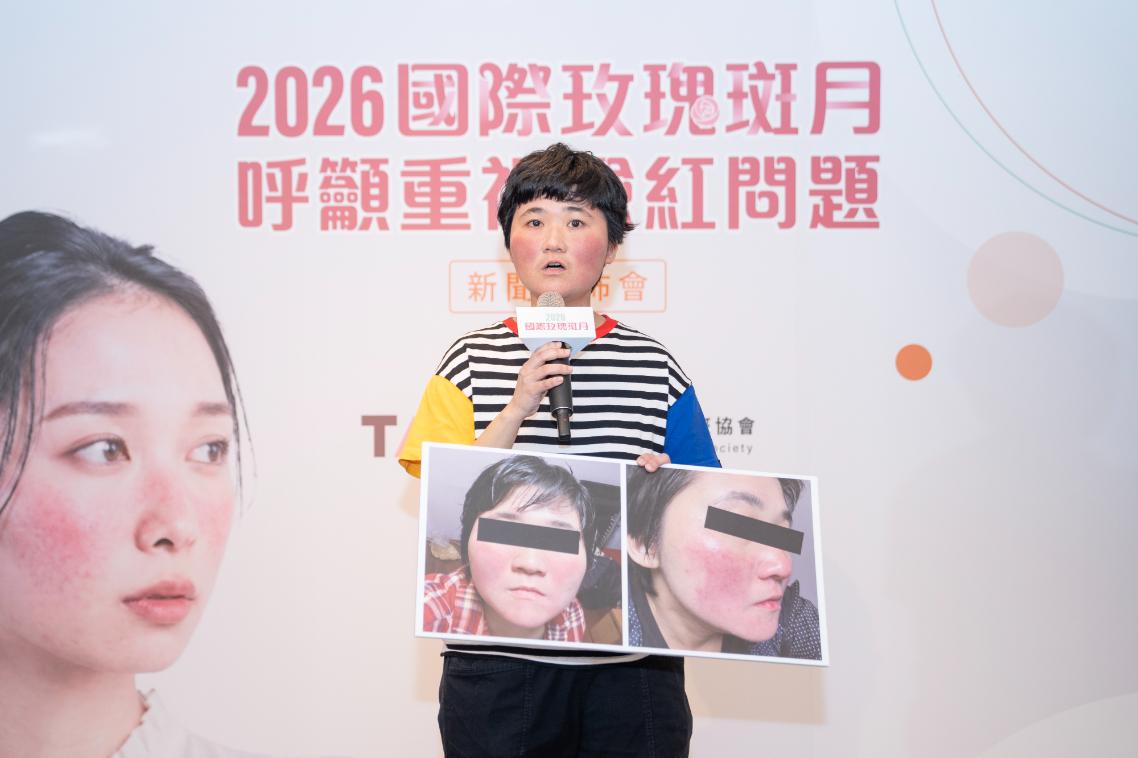 病友林小姐分享自身經歷。6年前她開始出現臉部紅腫、脫屑,遇日曬與壓力即反覆發作,甚至在會議中出現灼熱與緊繃感,影響工作與人際互動。