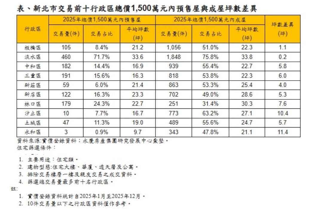 隨著新北市房價持續走高,1500萬元成為許多首購族設定的總價上限,但同樣的預算,預售屋與成屋能買到的空間卻大相逕庭。永慶房產集團比較新北市熱門交易行政區中1,500萬元以下預售屋與成屋的交易占比及平均坪數。數據顯示,多數行政區在此價格帶內,預售屋不僅交易占比偏低,可購入的坪數也明顯不及成屋。