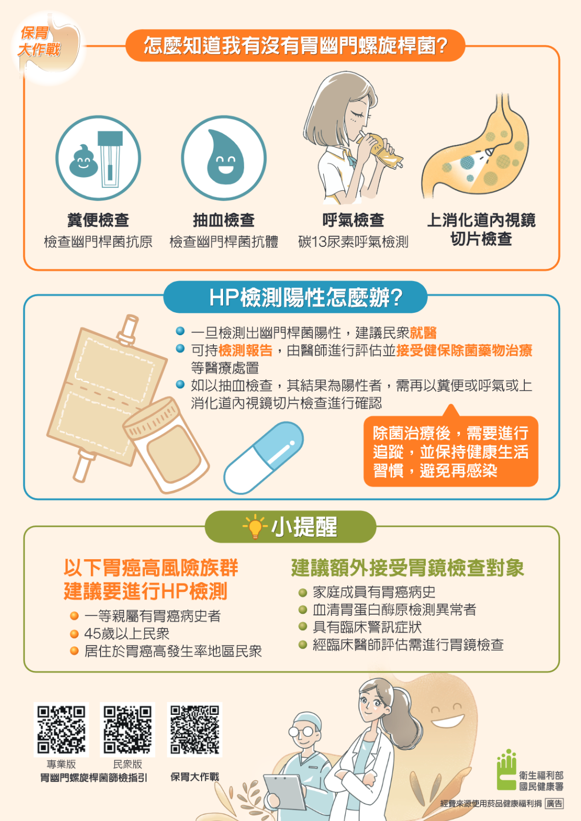 另外,幽門螺旋桿菌主要經口傳染,家庭成員之間相互傳染相當常見,因此若成人確診感染,同住家人建議考慮一起篩檢。