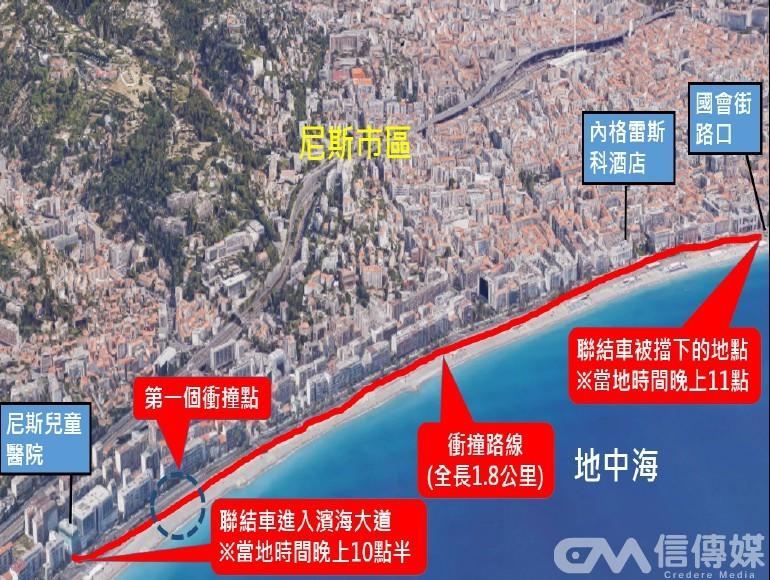 時間就在7月14日的晚上,位於法國南部的濱海城市尼斯,當時知名的濱海大道(Promenade des Anglais)上正聚集了許多觀賞國慶煙火的民眾,就在煙火施放結束後不久,一輛大型聯結車從尼斯兒童醫院所在的位置,衝進禁止車輛通行的人行步道,並開始沿著濱海大道以高速衝撞人群,一直開了1.8公里才在國會街(RUE DU CONGRÉS)的路口被警方阻擋下來,駕駛被當場擊斃,但已經造成至少84人死亡,其中包括多名兒童,另外還有上百人在事件中受傷。