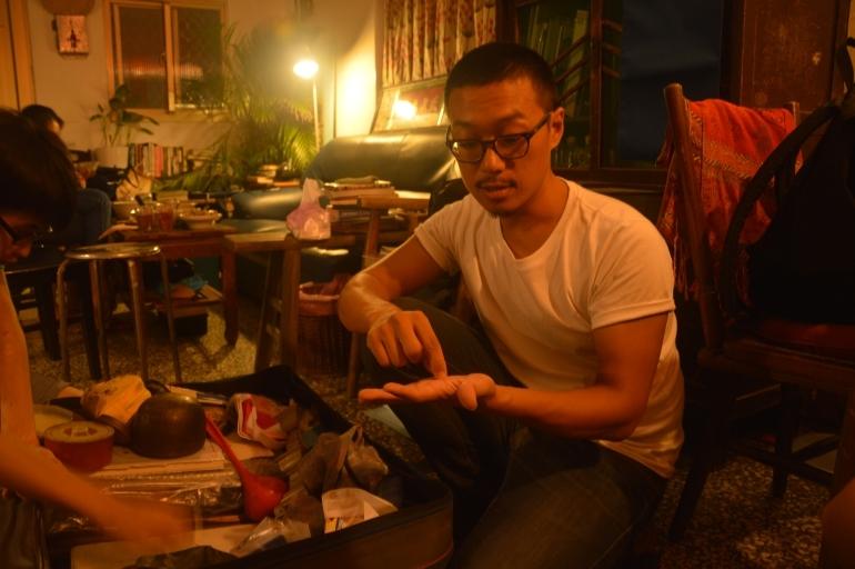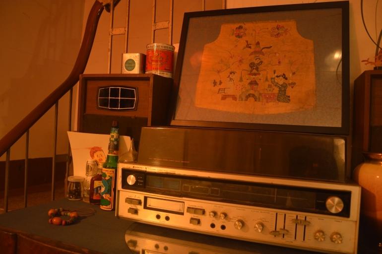 時序回到晚上沒有燈火闌珊只有昏黃路燈的鹽埕,吹著徐徐的晚風感覺連時光都走的很慢,帶著攝影師在晚上八點的用餐時間走進了怡志的家中,鹽埕晚上的昏黃燈光似乎偷偷的溜進了怡志家,沙發上「正氣參天」的橫掛、木櫃上的黑膠唱片機,還有角落的神明燈等等許多從外公家搬來的寶物,靜靜的待在客廳的各個角落不說話,卻藏不住背後一段段關於時間的故事,怡志的女友忙著燒煮一道道的好菜,「喝飲料嗎?」怡志問,還沒反應過來,兩杯沁涼台啤便端了上來,我們在客廳吹著冷氣,台啤還未下肚,便被一屋子惹人心醉的氛圍下,聽著怡志訴說著外公家的故事。