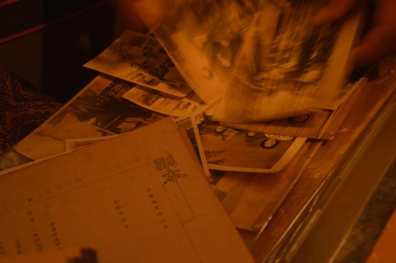 對於黑色行李箱內的寶物,怡志如數家珍的介紹著每一樣。碗瓢、燭臺、燒到一半的蠟燭、外婆愛用的包包、囍字剪紙,還有好多好多怡志帶回來的回憶;有的東西之於怡志別具意義、有的東西怡志想不起來未何而放。事實上,怡志把部分外公家的「記憶」搬來鹽埕區的新家中,沙發上的「正氣參天」橫掛與角落的神明燈來自於外公家三樓的神明廳、客廳的木櫃與黑膠唱片也來自外公家中,還有好多好多「記憶」放在新家客廳角落的黑色行李箱中,行李箱一開,撲鼻而來的是陳年的樟腦丸味,味道難以形容但又似曾相似,我不會說這味道好聞,但可以確信的是這個味道有個名字,叫做「時間」。流竄出來的不只「時間的味道」還有各式各樣怡志從外公家蒐羅過來的照片、包包、燈臺甚至是香皂,期中不少是外公帶回的舶來品,除了家族史的脈絡參考外,靠著每張黑白照片的背後皆有著外公的親筆註解,拼湊出外公家中的過去與現在。