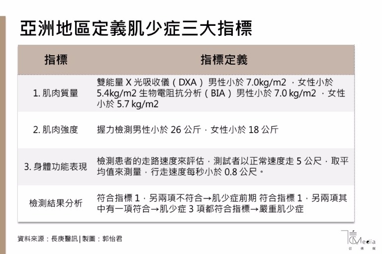 肌少症診斷及分級標準,包含有三個部分,低肌肉質量、低肌肉強度及低身體功能表現。若老年人肌肉質量降低到標準以下,即為「肌少症前期」;若低肌肉質量再加上低肌肉強度或低身體功能表現,即為「肌少症」;若三者都存在,即為「嚴重肌少症」(表)。