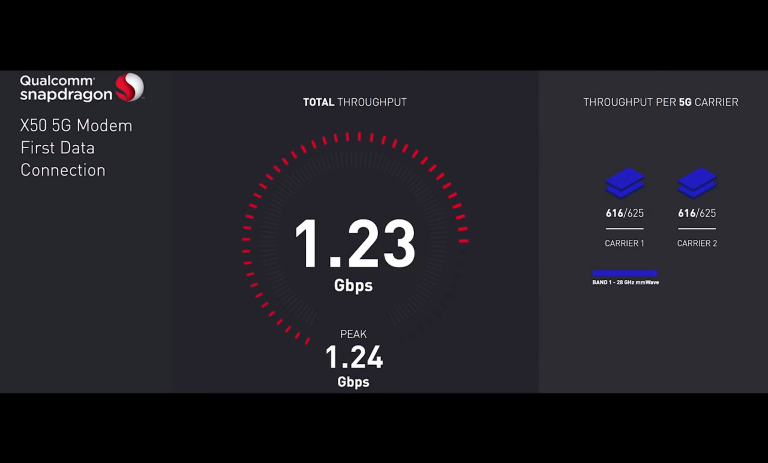 一年前高通便發佈了X50 5G,直到今天高通發表手機上的測試成功,實現了5G的連接實力,測試結果達到1Gbps的速度,高通表示,未來完成5G的整體部署後,能夠達到5Gbps的速度,想要下載一部高清電影,將會只是彈指之間的事。