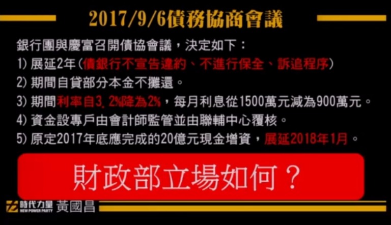 緊接著,針對慶富延遲繳交利息的情況,經過黃國昌追問,蔡慶年回應目前已欠了3000萬的利息。根據黃國昌的資料,慶富每月應支付公股行庫團約1500萬的利息,顯示慶富現已2個月欠息。而黃國昌隨即質問蔡慶年,慶富兩月未繳息是否已構成「契約重大違約事由」?蔡慶年沒正面回答問題,黃國昌爆氣表示「這就是我國公股銀行面對嚴重弊案的態度嗎?」最後,蔡慶年才回應,若慶富欠息滿3個月,便會列入逾期放款。