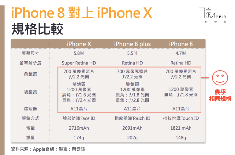 另一方面,選購手機通常會關心的問題−價格,iPhone X、iPhone 8 Plus、iPhone 8三者價格分別是,35900元、28900元、25500元(以最低規格官網報價比較),基本上從iPhone 8 Plus跳到iPhone X,就差了7000元,而最大的差異在更大的螢幕與十週年紀念這兩個特色,選擇哪一台手機就看使用者最注重哪個部分了。