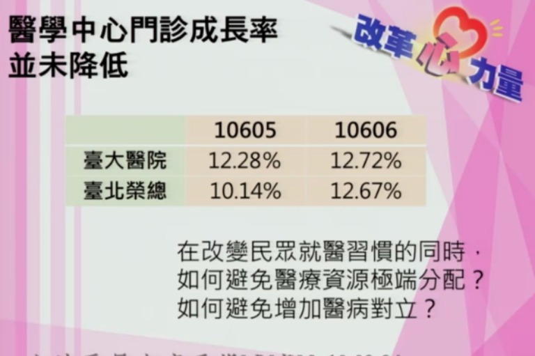 根據國民黨立委李彥秀所整理的資料,自衛福部拍板調高部分負擔以來,台大醫院以及台北榮總等大型醫學中心的門診量是不減反增。對此衛福部常務次長薛瑞元認為,目前政策施行時間還不長,希望延長一段時間再來作檢驗。