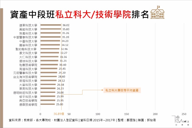 此次樣本全部科大、技院資產平均36.89億元,在平均數以上的是前18大「好野」的科技大學,剩下的50所私立技專院校資產都不到平均數,而德霖技術學院、南亞技術學院、育達科技大學到遠東科技大學等21所學校資產介於25億元到36億元初頭,可視為「中段班」,其中位於新竹縣芎林鄉的大華科技大學董事會還有縣長邱鏡淳出任一席董事。