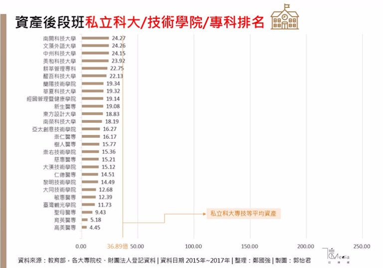 資產總額低於25億元共有26所私立技專院校,更有20家低於20億元,比台北育達商職資產的35億元還低,名單上包括今年6月教育部視導未過關的嘉義大同技術學院、高雄育英醫護管理專科學校與亞太創意技術學院等,而位於花蓮的臺灣觀光學院目前只保留一個系,許多系的學生已經轉到他校上課,也面臨退場危機。