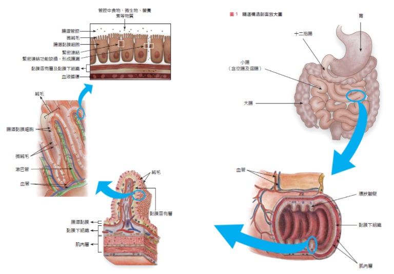 腸道的黏膜,是由一層薄薄的黏膜細胞(enterocyte)構成,黏膜細胞會分泌黏液到黏膜表面,而黏膜細胞底下則是黏膜固有層(lamina propria),再往下則是黏膜下組織(submucosa)與肌肉層等。
