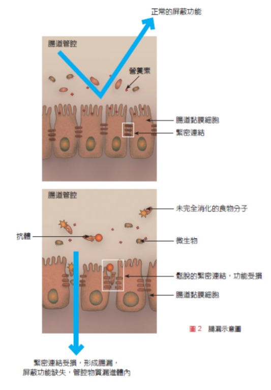 緊密連結的破洞或功能異常,造成細胞間的縫隙變大,腸道通透性因而增加(Increased intestinal permeability),這就是所謂的「腸漏症」(Leaky gut syndrome)。