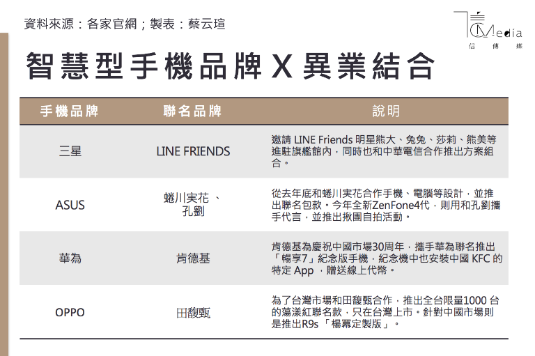 近幾年手機品牌異業結合漸漸成為了趨勢,從今年ASUS大舉和韓星孔劉合作外,去年ASUS也和蜷川実花一起合作設計手機、電腦、包包,都比單純聘請代言人的聲勢要更加強烈。大陸品牌OPPO也為了台灣市場和田馥甄聯名推出台灣限定款,女神魅力加上價格優勢,銷售成績也不俗。而市佔率緊逼蘋果的大陸品牌華為,在大陸也與肯德基合作推出肯德基紀念機,裡面還有可以拿到肯德基優惠的APP,創造顧客與廠商都雙贏的局面。