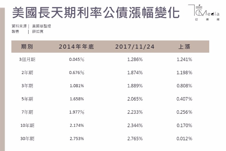 美國3個月期國庫券利率從2014年年底的0.045%上漲至2017年11月底的1.286%,就殖利率而言漲了1.241%,然而長天期公債的利率的漲幅卻相對低上許多,也就是越長天期的利率,上揚的幅度越低,請見下表:
