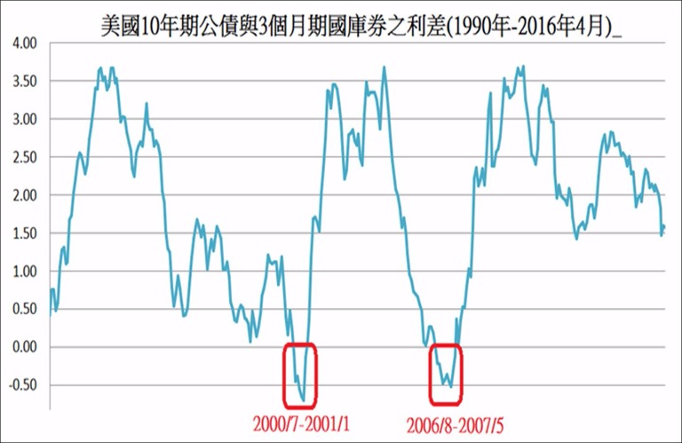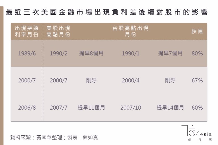過去二十多年來一共出現三次負利差,2000年4月那次,剛好美股與台股的高點相符,而1989年與2006年那兩次,負利差出現後,不論是台股還是美股,都還繼續漲了一小段時間(大約是7~14個月)。