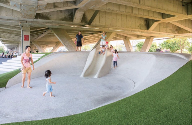 位於冬山火車站的鐵道橋下,有一個鋪滿柔軟人工草皮的小山丘,及純白色的溜滑梯;小孩跑上跑下玩得不亦樂乎,大人在一旁陪著玩耍或聊天說笑。這裡除了不定期舉辦的小市集,還有造型獨特的公共裝置藝術,更貼心地規劃了停車場,加上附近的「冬山河生態綠舟」景點,