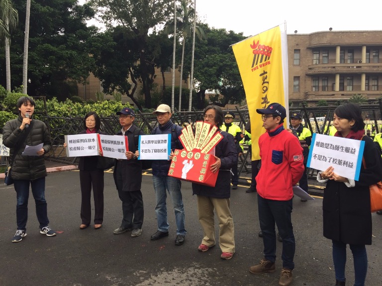 今日(8日)台灣高等教育產業工會在行政院前抗議《私校退場條例》打假球,名義上是要輔導辦學不力的私立大學退場,實質上卻開了巧門讓私校校董鑽漏洞,喊出「轉退條例在放水,校產歸公一場空;私人興學是做功德,不是為了竊取校產」的口號。