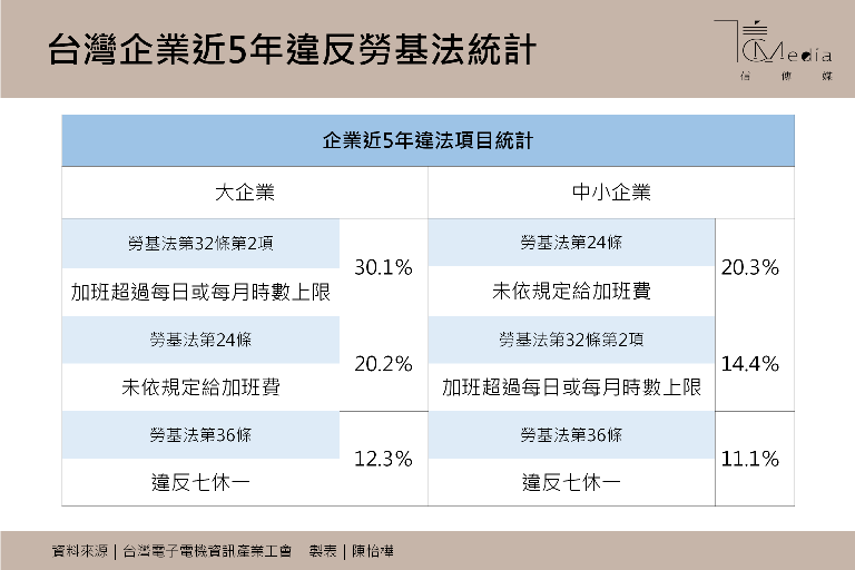 值得注意的是,中小企業的調查結果與大企業相反,違法項目最多反而是未依規定給加班費(20.3%),接著是加班超過每日或每月時數上限(14.4%)。台灣電子電機資訊產業工會強調,中小企業的主要問題其實是沒給加班費,「對中小企業勞工來說,更需要擔心的是領不到法定加班費,而非想加班卻沒機會。」