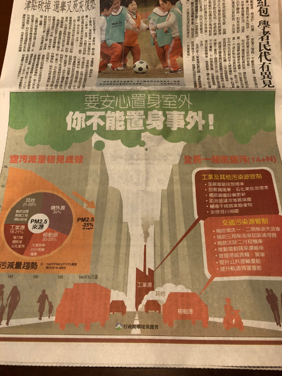 環保署在12月18日,中南部反空污大遊行的第二天,在各大報上刊登「要安心置身室外,你不能置身事外!」的半版廣告,似乎想要回應台灣健康空氣聯盟的大遊行,然而環保署是拿錯考卷,給錯了答案。不過環保署說「你不能置身事外」,言下之意是「我要置身事外」,所以沒有說「我們不能置身事外」,這不是文案太差,就是碰上了老實樹。