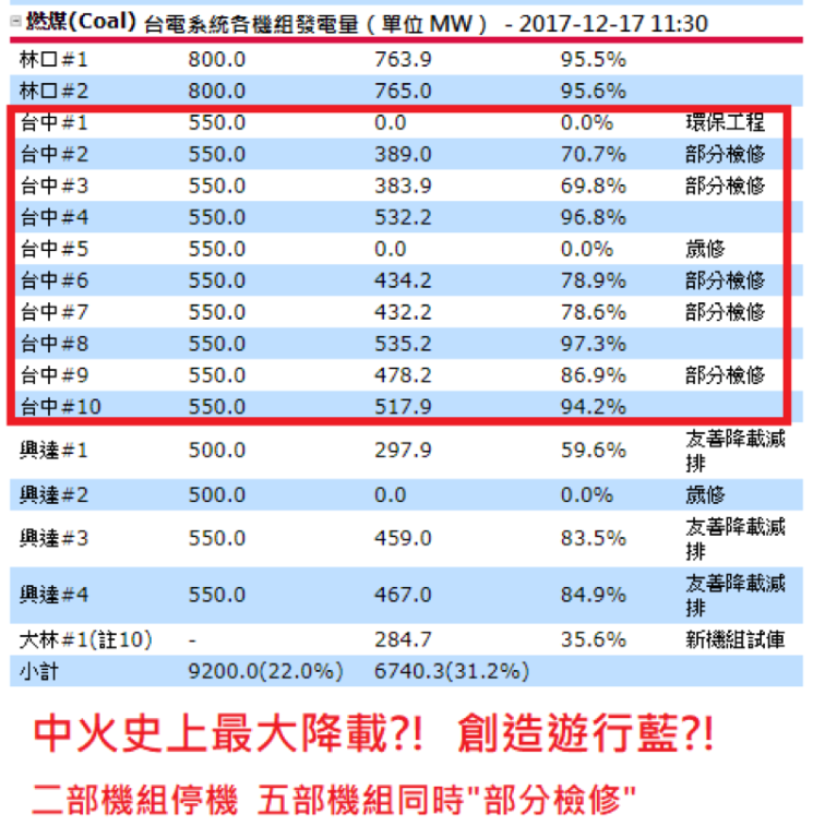 南部的興達火力電廠4部機組1部機在歲修,其他4部都掛起「友善降載減排」,使得高雄的空氣也健康起來。(「友善降載減排」也是台電的創新名詞,令人擊節讚嘆不已!)