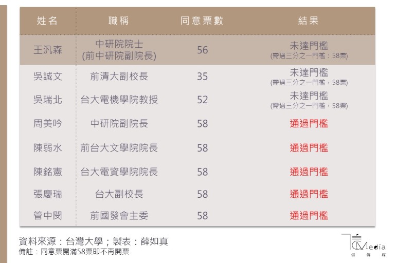 湊巧的是,本次校務會議中前三位候選人王汎森、吳誠文、吳瑞北都意外落馬,不過三人都以僅差幾票就可晉級。此次台大校長遴選首戰也被稱為「台大和中研院的戰爭」,但此次僅副院長周美吟順利闖關成功,人文背景出身的院士王汎森則無緣晉級。