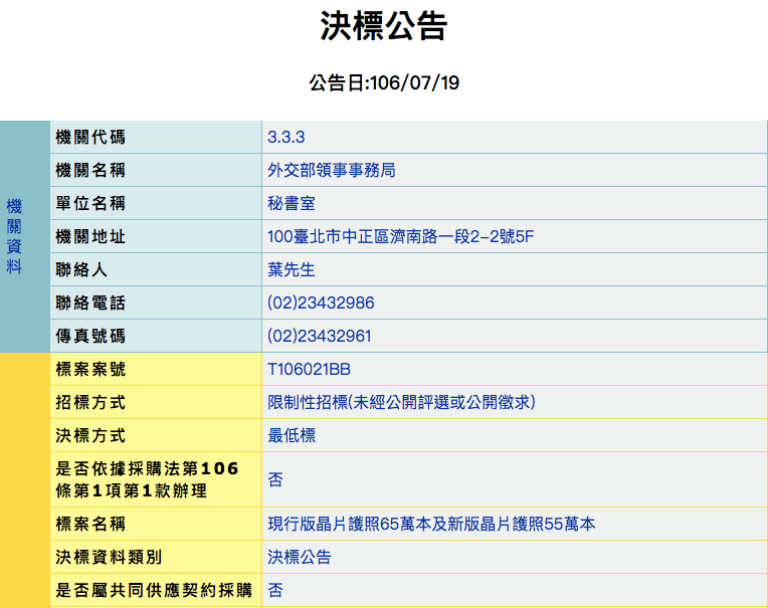 然而,新版晶片護照首批已印製完成20萬本,根據政府採購網資料顯示,現行版晶片護照65萬本及新版晶片護照55萬本決標金額為4億8415萬元,換算下來,平均一本護照成本約400元,印錯的20萬本再加上後續若要重印20萬本,算起來至少損失約1.6億元,而這筆因「出包」而多出來的成本費用又該由誰埋單?