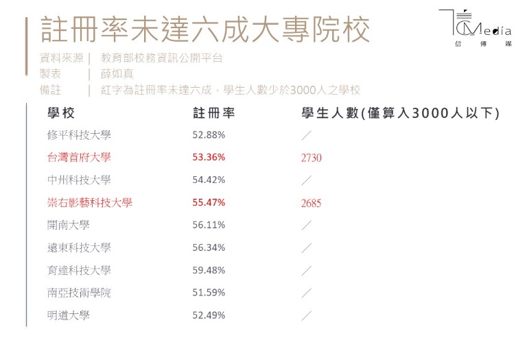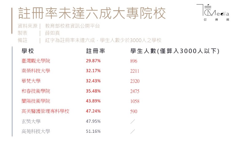 根據行政院會所通過的《私立大專校院校退場條例》草案,第七條中明文規定「全校學生數未達3000人,且近二年新生註冊率均未達百分之六十之學校將列為專案輔導學校」。而在此次所公布的資料中,共計有17所學校未達六成門檻,其中有8間學校在學人數也沒達到3000人標準,台灣觀光學院的註冊率甚至不到三成。