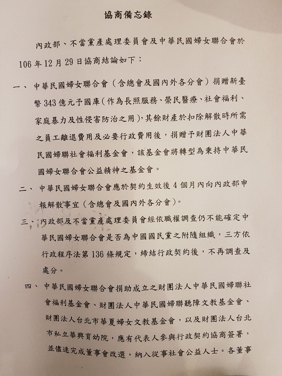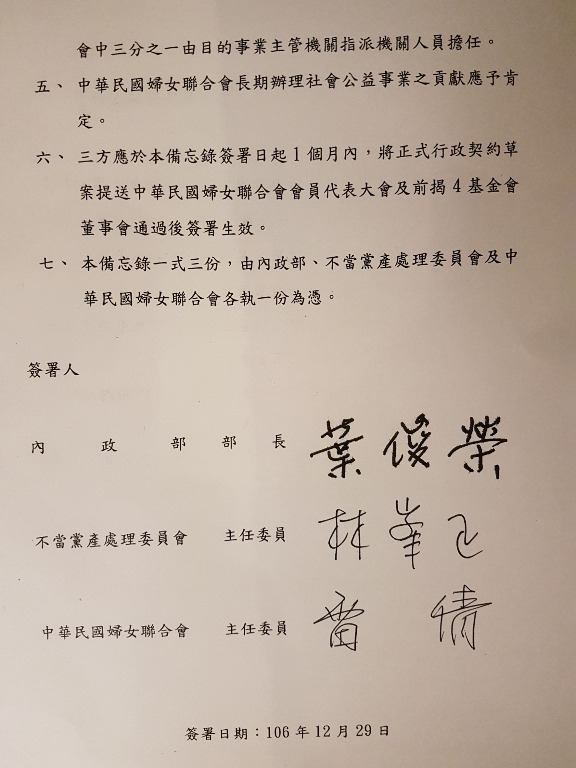 內政部長葉俊榮、黨產會主委林峯正,以及婦聯會主委雷倩今(29)日下午共同簽訂備忘錄。這一個禮拜內,婦聯會可以說是風雲大震盪,在2017年即將步入尾聲的今天,終於告一段落了。