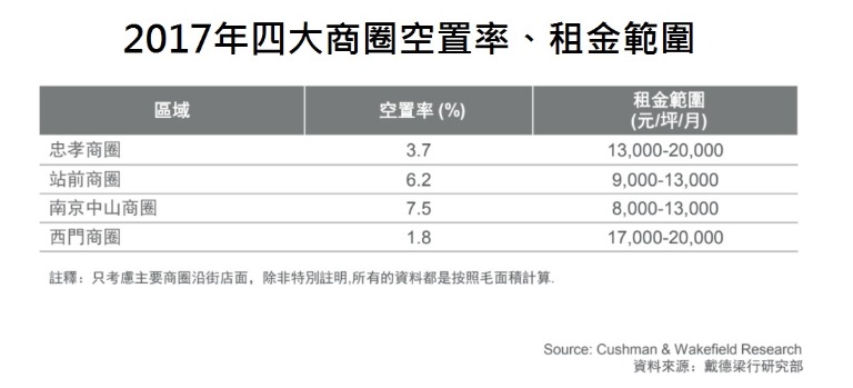 所幸,2017年底已開始改善,根據戴德梁行統計,忠孝商圈的空置率在2017年第4季已回到3.7%,較前一季下降0.5個百分點,如果把特賣會也當成空店面計算,空置率為7.9%,與前一季相比同樣下降0.5個百分點。