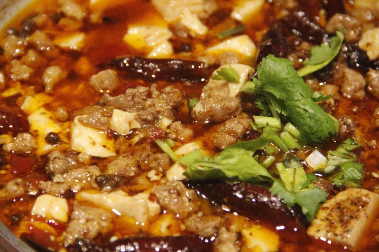 5.講究的話,起鍋前在豆腐上加上一匙花椒粉,辣油燒熱(但不要到太熱的地步)淋在花椒粉上增香。