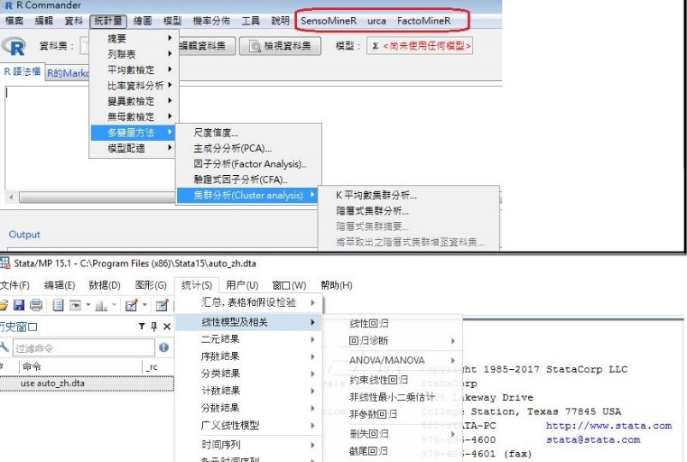 世新財金系教授率先搶下R語言(上)繁體中文介面定義權,但另一套軟體Stata(下)被簡體字介面先攻占了。(攝影/翻攝自何宗武教授臉書)