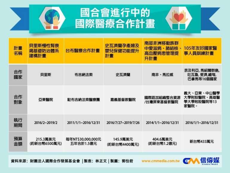 在國合會的計畫說明書中指出,這項從 2016年2月開始執行,為期3年的醫療合作計畫總經費約215萬美元,資金來源為外交部、貝里斯衛生部與亞東紀念醫院。今年5月,亞東醫院院長林芳郁也親自帶領該院的腎臟專科醫療團隊,捐贈100個人工腎臟給貝國衛生部,並且協助貝國建構基礎慢性腎衰竭防治體系,降低因慢性病造成之疾病負擔。