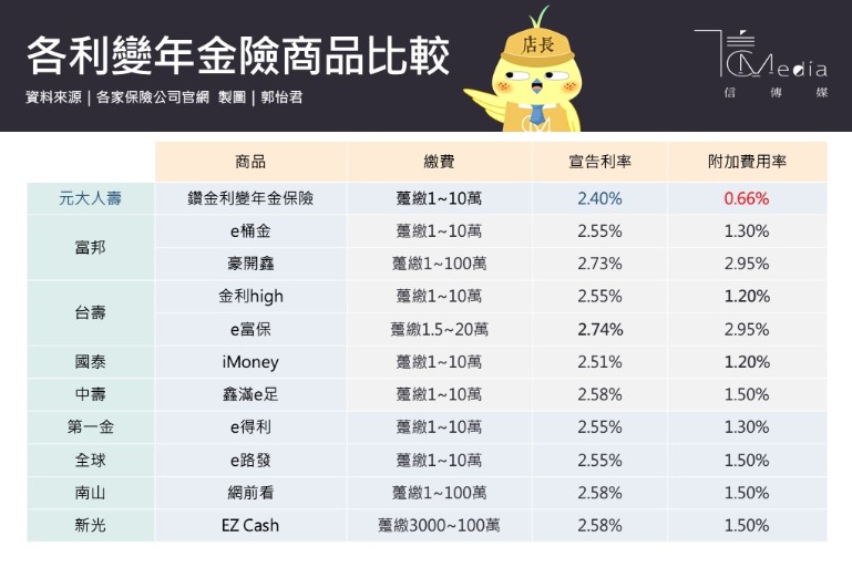 若比較各家保險公司主要利變年金險的相關費率,會發現宣告利率大同小異,但元大人壽附加費用率是同業中最低的,計息金額相對同業而言也最高。