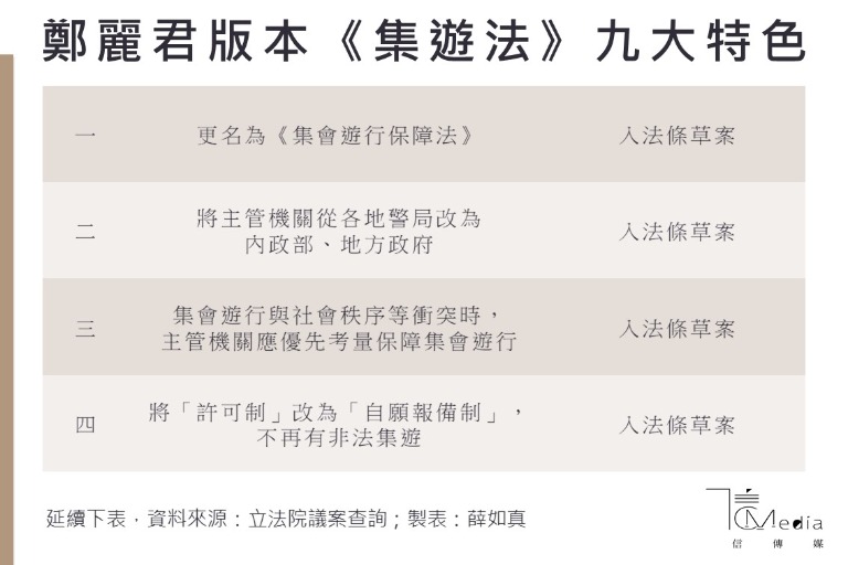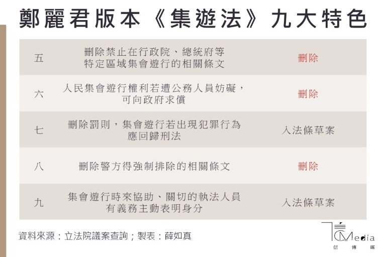 《集會遊行法》修正草案在內政委員會排審時,以行政院版本為主,輔以接受度較高的時任立委、現任文化部長鄭麗君的版本審查,接連討論5天後終於審查完竣。