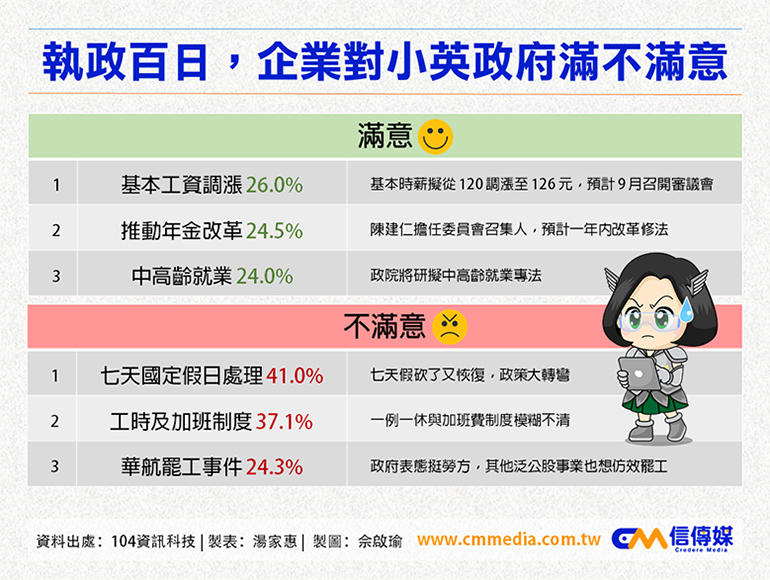 根據104資訊科技調查,企業對蔡英文政府上任至今的整體表現,不滿意達58.3%,其中最讓企業不滿的是砍七天假事件,砍了又恢復、政策大轉彎,占41%;工時及加班制度,究竟是一例一休還是周休二例,勞動部遲遲不給答案占37.1%;另外則是華航罷工事件,政府表態支持勞方,工會訴求全數通過,其他泛公股事業也打算仿效爭取權益,占24.3%,顯示企業對於蔡政府處理勞資問題沒有信心。