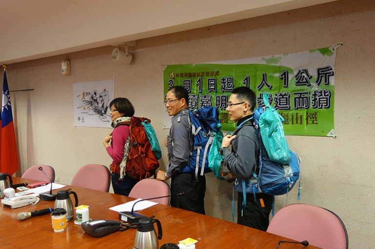 台東處劉瓊蓮處長(左一)、林務局廖一光副局長(中)背負一公斤合照。(圖片來源/林務局提供)
