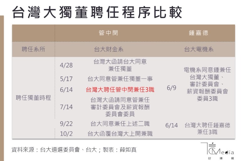 先前《信傳媒》便曾報導「管中閔擔任台灣大哥大獨董一職是否符合正當程序?」當時,台大回應管中閔擔任獨董職校方早在2017年5月便已核定。不過,問題來了。事實上,管中閔在台灣大兼任的職權不只獨董一職,還有因獨董一職連帶產生的審計委員會及薪資報酬委員會委員兩個職位。根據遴委會1月31日的會議紀錄所示,5月17日時台大同意管中閔兼任獨立董事,而台灣大於7月14日函請台大同意管兼任上述2個委員會的職位,而台大在9月22日同意,10月2日函覆台灣大同意上述兼職。