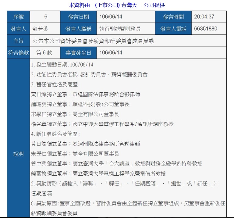 意即,台灣大在10月初才接獲台大的發函同意管中閔3項兼職。不過,對照證交所公開資訊觀測站上台灣大的會議資料,紀錄上明確顯示管中閔6月14日起即擔任獨立董事、審計委員會及薪資報酬委員會委員3個職位。綜上所言,是否涉及違法兼職?對此,台大回應此為行政流程的「空窗期」,校方最終仍同意管中閔兼職。不過,台大也坦言監察院也針對此事調查。